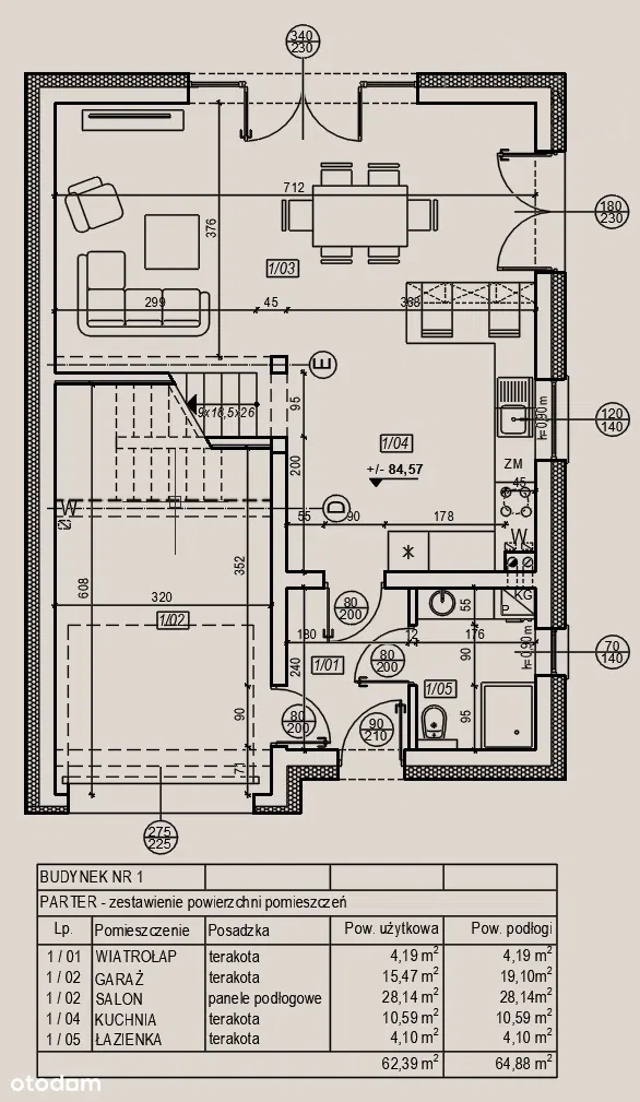 – garaż (o pow. użytkowej 15,47m2, pow. całkowita 19,10m2).