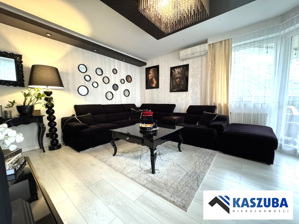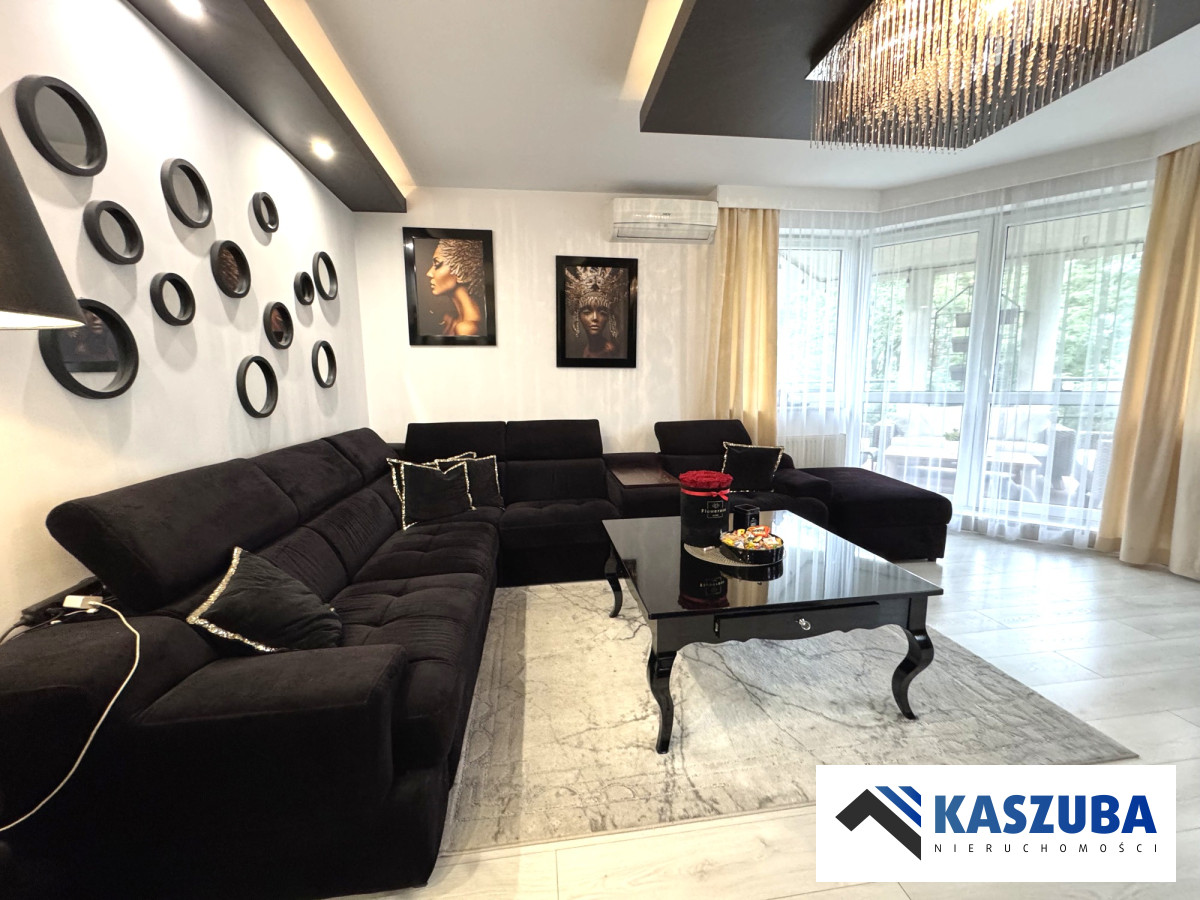 – salon z wyjściem na przestronny balkon, wyposażony w dużą kanapę narożnikową, stolik kawowy, komodę, szafkę pod TV, oraz stół jadalniany z 6-ma krzesłami;
