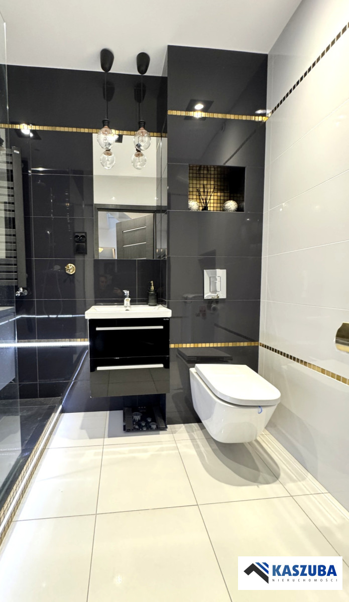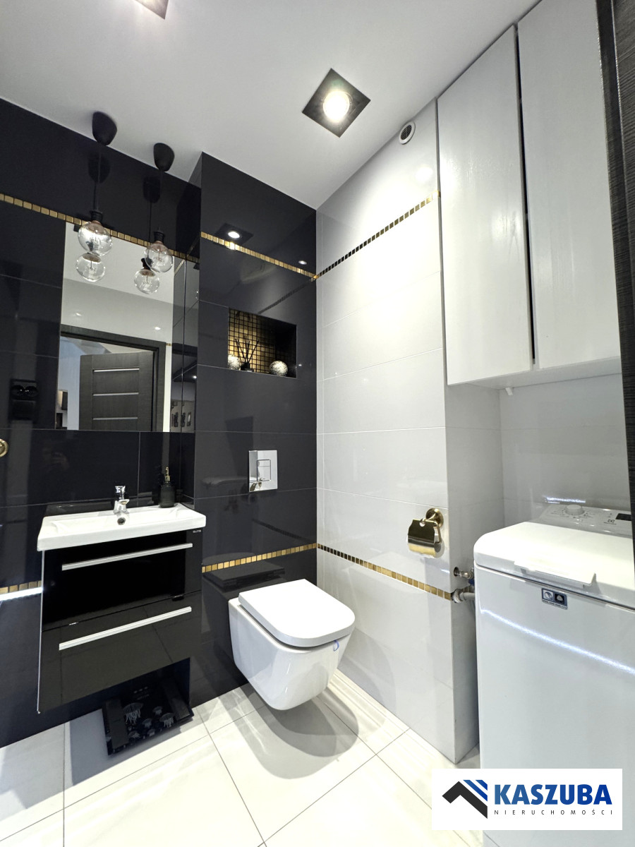 – łazienka z prysznicem lustrem, toaletą oraz pralką;